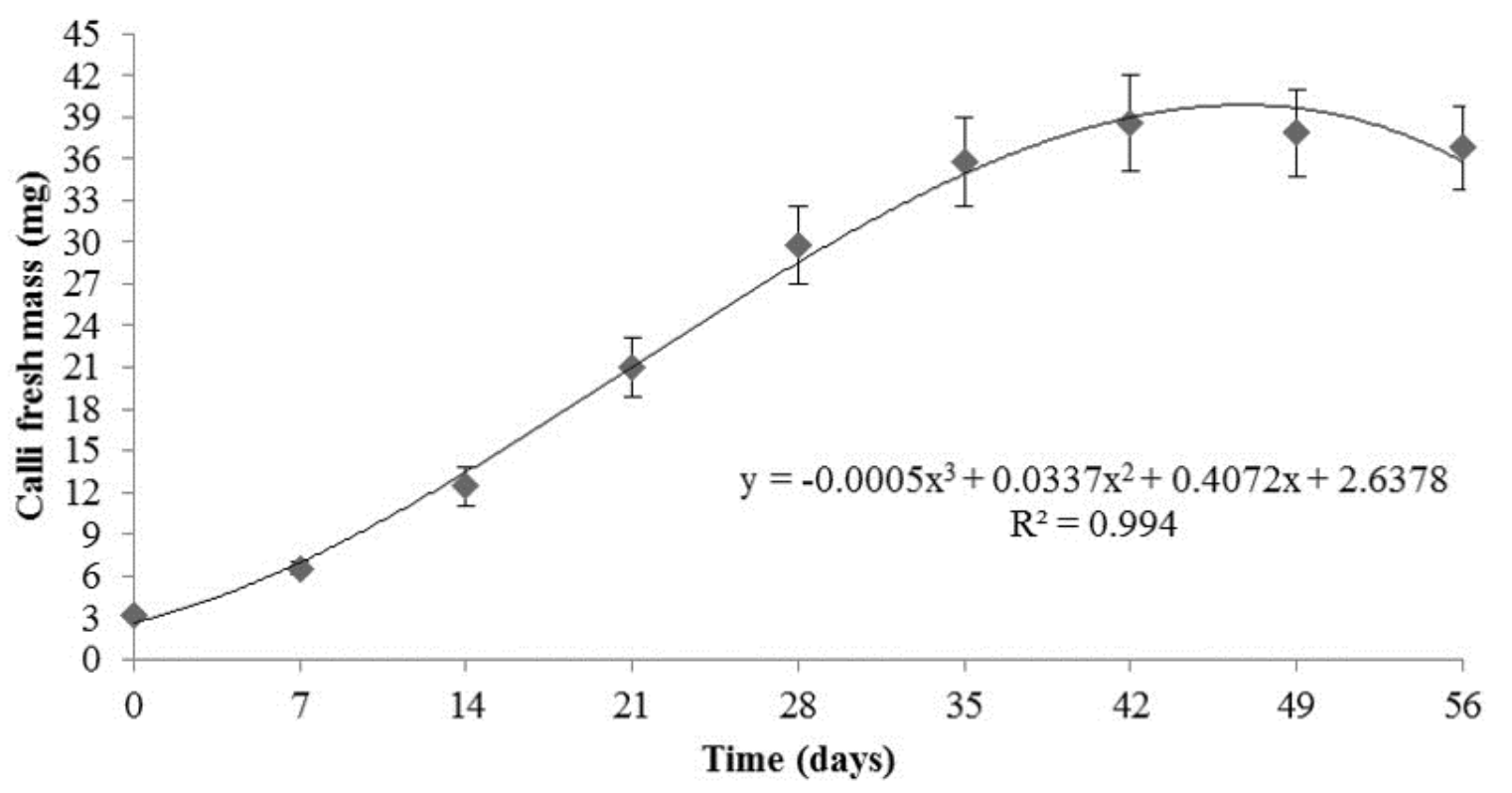 The lag phase occurred up the 7th day of culture, resulting in a weight gain of 9% of the total. The exponential growth phase occurred between the 7th and 28th day of cultivation, and resulted in a weight gain of 66%. The linear growth phase, between the 28th and 35th day, resulted in a 17% gain of fresh mass. The deceleration period began on the 35th day and lasted until the 42nd day, resulting in 8% growth. Callus growth reached the stationary phase on the 42nd day post-inoculation, after which a reduction of 5% of the fresh weight was observed, indicating the beginning of the decrease phase.