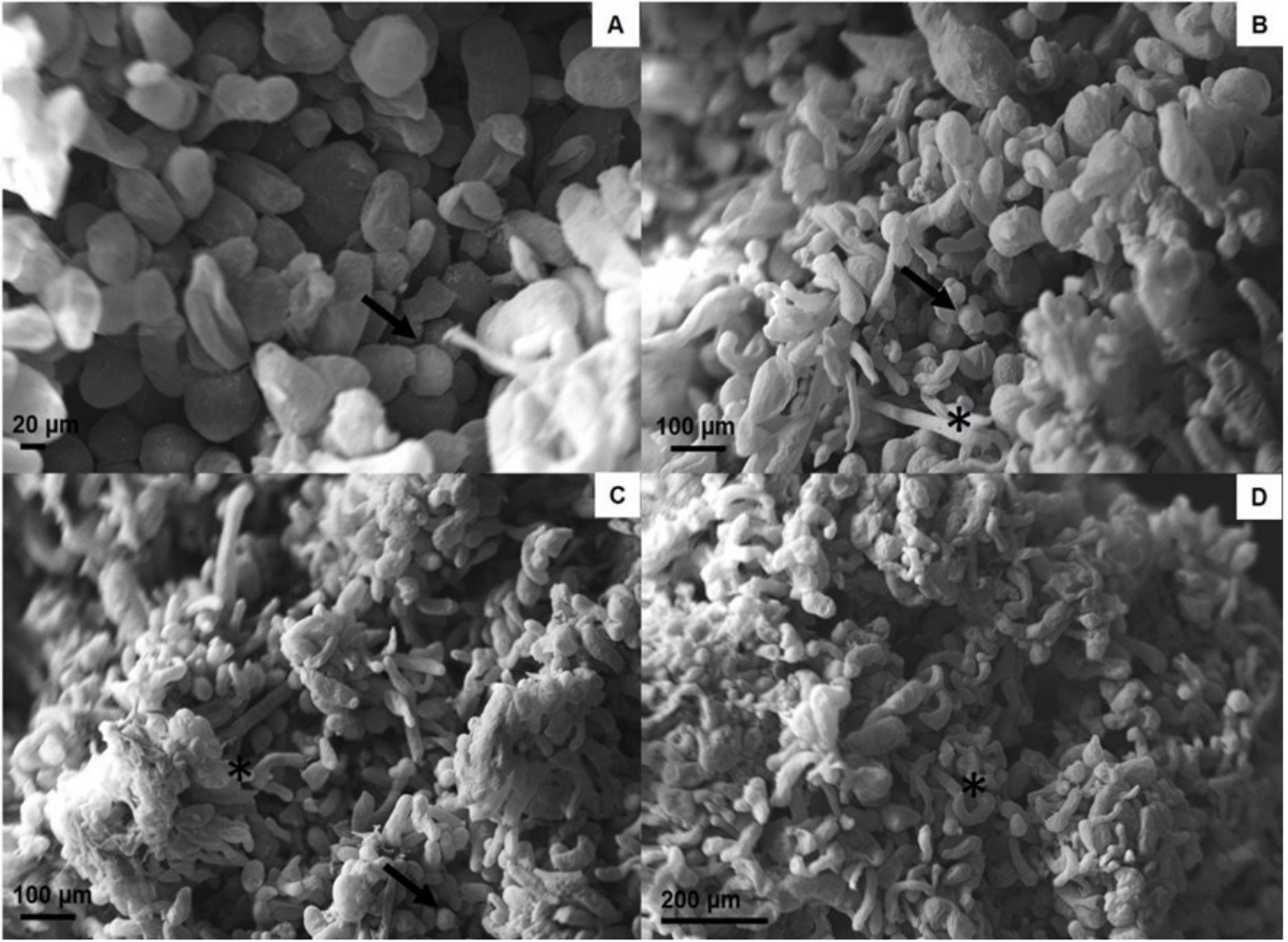 At 14 days, during the exponential growth phase, the ratio between the number of elongated cells and the number of isodiametric cells was low. However, at 28 days, still in the exponential stage, and at 42 and 56 days, in the deceleration and decrease phases, respectively, the ratio between the number of elongated and isodiametric cells increased, thus characterizing a negative relationship between increasing numbers of elongated cells and decreasing numbers of isodiametric cells over time (Figure 3B, C and D).