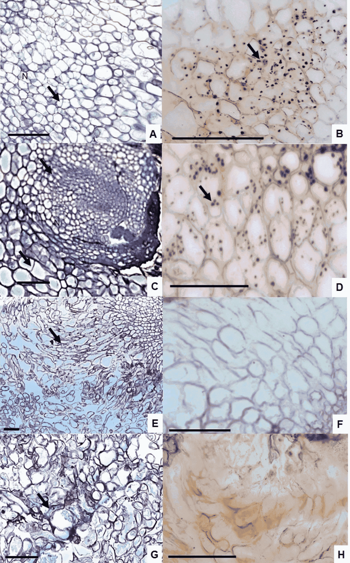 Staining with Lugol’s solution revealed the presence of starch grains in the callus cells at 14th and 28th days (Figure 4B and D), but none at 42th and 56th days (Figure 4F and H), indicating greater embryogenic potential at beginning of cultivation (at 14th and 28th days).