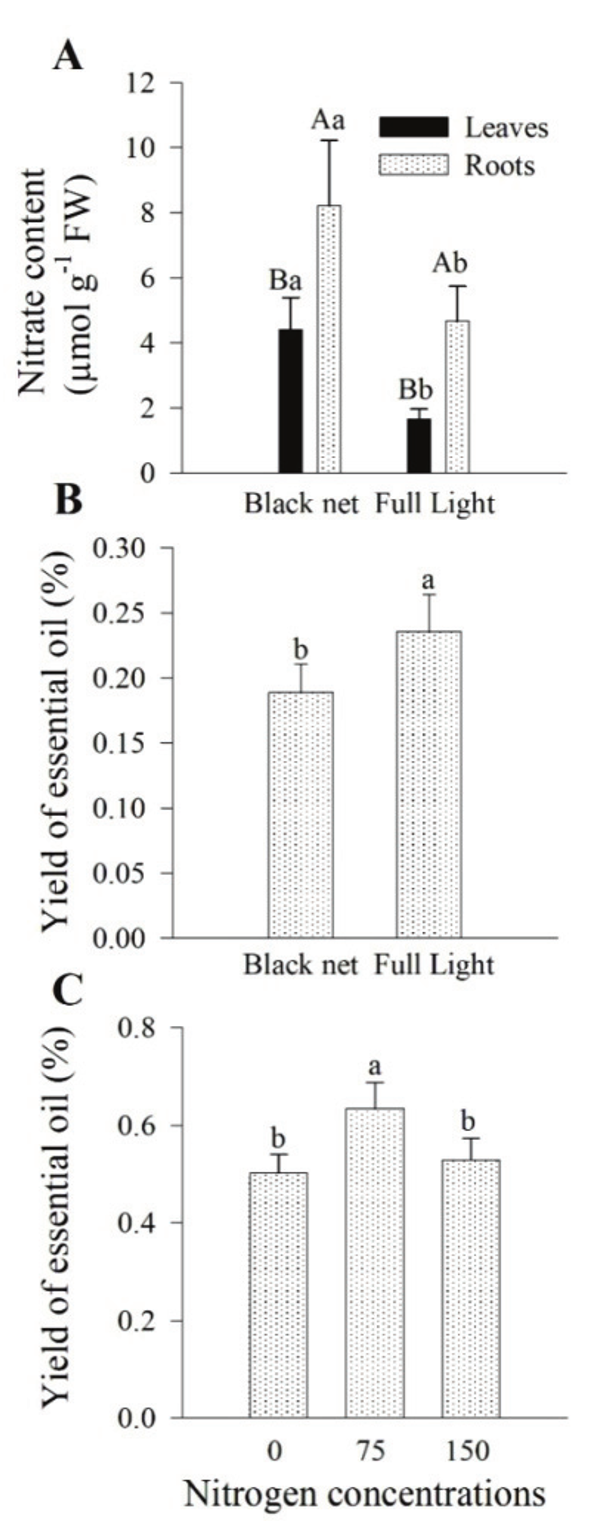 Either the availability of light can affect the uptake and assimilation of nitrogen, through the regulation of enzymes such as NR, or providing an environment with a higher level of nitrate or ammonium distributed in the soil (Stagnari, Galieni, & Pisante, 2015). Both factors also influence the production of secondary compounds in medicinal plants. However, there is a lack of information regarding the influence of light and nitrogen availability on the metabolism of A. millefolium. Our understanding of these features has the potential to provide growing conditions that are optimal for enhancing biological activity. Therefore, this research aimed to investigate nitrogen metabolism and the essential oil of A. millefolium grown under different levels of shading and concentrations of urea.