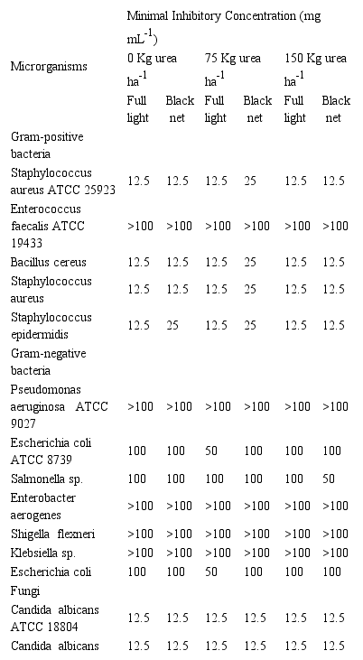 Full light exposure enhanced nitrogen metabolism in A. millefolium. However, the species adapts well to shading being able to produce increased yields of essential oils compared to plants grown under full light. Regarding nitrogen supply, intermediate concentrations of urea (75 kg ha-1) resulted in optimal nitrogen metabolism and essential oil yields. In addition, the antimicrobial activity demonstrated that the essential oil of leaves and flowers of A. millefolium is of great interest to the pharmaceutical industry, since knowledge regarding the components of this oil may enhance research facilitating the production of bioactive products that act predominantly against gram-positive bacteria.