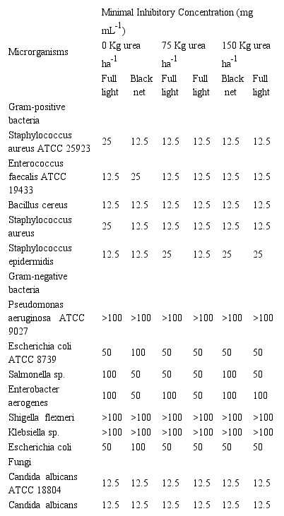 Biological activities of essential oils of both yarrow leaves and flowers were similar among treatments (Table 9-10). Thus, the different concentrations of nitrogen and shading levels studied did not affect the inhibitory activity of the essential oil (p < 0.05). The MIC values of essential oils from yarrow leaves ranged from 12.5 to 25.0 mg mL-1 for S. aureus ATCC 25923, B. cereus, S. aureus and S. epidermidis bacterial strains (Table 9). Similarly, C. albicans ATCC 18804 and C. albicans were inhibited by 12.5 mg mL-1 essential oil (Table 9). On the other hand, MIC values for E. coli ATCC 8739, Salmonella sp. and E. coli bacterial strains ranged from 50 to 100 mg mL-1. The essential oil of yarrow leaves did not inhibit the growth of E. faecalis ATCC19433, P. aeruginosa ATCC 9027, E. aerogenes, S. flexneri, and Klebsiella sp. bacterial strains at any of the concentrations tested.