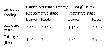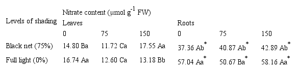 Nitrogen is an essential element for plants that is available in agricultural soils mainly in the form of nitrate and ammonium (Pinton, Tomasi, & Zanin, 2016). In the leaves of shaded plants treated with the highest concentration of nitrogen, enhanced nitrate accumulation was observed. This increase in nitrate levels is due to the low light intensity required for ion reduction and the increased availability of nitrate supplied by nitrogen fertilizer. Further, the increased levels of nitrate found in the roots of unshaded plants compared to those that were not shaded may be a result of enhanced nitrification of the soil. Under these conditions, decreased humidity and increased temperatures may have favored microbial activity in comparison to shady conditions, thus allowing more nitrate to be accessed via the roots of plants. In contrast, nitrogen supply in soil treated with 75 kg of urea ha-1 for reproductive-stage plants seems to have improved nitrate metabolism, thus reducing its accumulation in the leaves of shaded and unshaded plants and the roots of control plants.