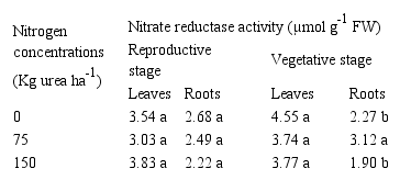The activity of NR (EC 1.6.6.1) was previously evaluated using plant materials harvested at different periods of the day. Researchers were able to determine that 8:30 am was the best time to collect materials for the analysis of NR activity (data not shown). The activity of NR was assessed in vivo according to Klepper, Flesher, and Hageman (1971) with some modifications. Fresh leaves and roots (0.5 g) were incubated in 0.2 M phosphate buffer (pH 7.5) containing 0.1 M KNO3 and 1% (v v-1) propanol. Afterward, plant material was vacuum-infiltrated three times (300 mmHg for 1 min.) and incubated in a shaking water bath at 30ºC in the dark. Then, aliquots from the samples were collected and incubated with 1% (w v-1) sulfanilamide and 0.02% (w v-1) naphthyl ethylene-diamine dihydrochloride at 30ºC for 15 min. and posteriorly analyzed at 540 nm. A standard curve with sodium nitrite was performed for determining nitrite formation.