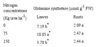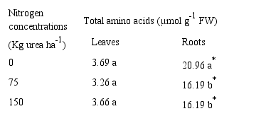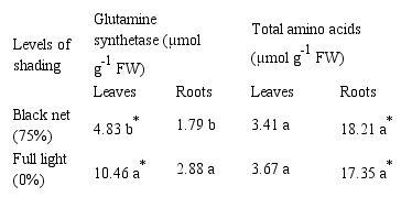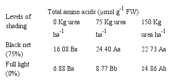 There was an interaction between shading and nitrogen levels with respect to levels of total free amino acids in vegetative-stage plants. In reproductive-stage plants, leaf and root amino acid content was unaffected by shading (Table 3; p < 0.05), but decreased 1.3-fold in plants treated with 75 and 150 kg urea ha-1 (Table 5). In contrast, in shaded plants at the vegetative stage, amino acid content increased 1.5-fold with 75 and 150 kg urea ha-1 treatments, respectively, when compared to levels in plants that did not receive urea treatment (Table 6). The free amino acid content in plants grown under full light increased (1.9-fold) post-treatment with 150 kg urea ha-1. Other concentrations of urea treatment did not significantly affect free amino acid content. The total amino acid content in plants treated with 75 and 150 kg urea ha-1 was greater (2.8- and 1.5-fold, respectively) when plants were shade-grown, rather than grown under full light (Table 6).