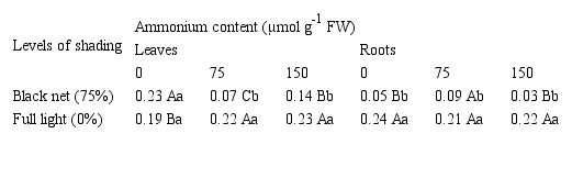 There was no interaction between shading or nitrogen dosage on ammonium content in A. millefolium reproductive-stage leaves. In contrast, in the vegetative stage, ammonium content was increased when the plants were shaded and treated with 0 kg urea ha-1 (3.3 fold) and 150 kg urea ha-1 (2.0 fold), respectively, compared with plants under shading and treated with 75 kg urea ha-1. Under full light conditions, the highest level of ammonium content was found in plants fertilized with 150 kg urea ha-1. However, in roots and leaves of shaded and unshaded plants, ammonium levels in response to nitrogen fertilization did not change (Table 8). Shading decreased ammonium levels in the leaves and roots of plants fertilized with nitrogen. This reduction was 3.1- and 1.6-fold for leaves and 2.3- and 7.3-fold for roots treated with 75 and 150 kg urea ha-1 respectively (Table 8). Ammonium levels were also decreased (4.8-fold) in the roots of shaded plants that did not receive nitrogen fertilization.
