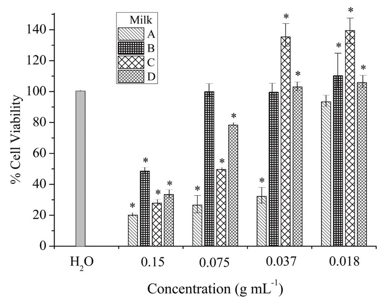 In the tetrazolium reduction assay (Figure 1), powdered infant formulas A, B, C and D, at a concentration of 0.15 g mL-1, as well as A, at concentrations of 0.075 and 0.037 g mL-1; C and D, at 0.075 g mL-1, significantly reduced cell viability in the culture of cells exposed to the milks in question, proving their cytotoxic potential. These results corroborate those observed in A. cepa (Table 01), since it also interfered with the functioning and consequently with cell proliferation. It should also be observed that, as in A. cepa, in the in vitro test, all the dairy products analyzed were cytotoxic at a concentration of 0.15 g mL-1, which is indicated commercially for consumption in the analyzed milk packages.