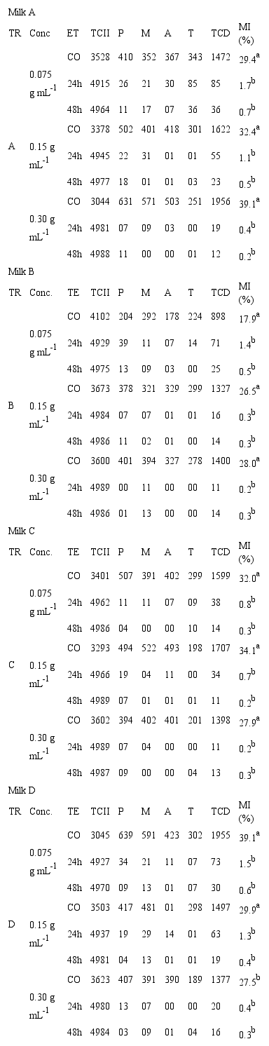 On average, 03 slides per onion bulb were mounted following the protocol proposed by Guerra and Souza (2002) and analyzed under an optical microscope at 400x magnification. For each onion bulb, we analyzed 1,000 cells, totaling 5,000 cells for each control, exposure times 24 and 48 hours of each treatment group analyzed. In this way, for any milk sample, we analyzed a total of 15,000 cells. Cells were observed in interphase, prophase, metaphase, anaphase and telophase. From this analysis, we determined the mitotic index (MI), we used the following equation: (total number of cells in mitosis ÷ total number of cells analyzed) x 100. MI value was the parameter for determining the cytotoxic potential of milk samples under study.