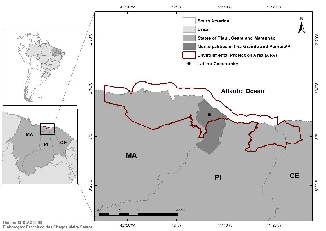 The Labino community is located in the municipality of Ilha Grande in Piauí State (PI), and is separated from the municipality of Parnaíba (2°51'02" S and 41°46'26" W) by the PI-116 state highway. The municipality of Ilha Grande had a population (in 2015) of approximately 9211 (Institudo Brasileiro de Geografia Estatística [IBGE], 2015), and the local Residents Association indicated that the Labino community is composed of 200 families and approximately 400 residents. The community is located within the Parnaiba Delta Environmental Protection Area (APA) – created by Federal Decree no. 99.274 on August 28, 1996; the APA comprises the entire coastline of Piauí State, as well as parts of the states of Maranhão and Ceara (Figure 1). The Parnaíba Delta APA was created to protect the mouths of the Ubatuba, Timonha, and Parnaíba rivers, improve the quality of life of resident populations by orienting and disciplining local economic activities, foment ecological tourism and environmental education, and preserve local cultures and traditions (Vieira & Loiola, 2014). The regional climate is type Aw by the Koppen classification system, with a rainy season from January to June and a dry season from July through December (Bastos, Andrade Junior, & Rodrigues, 2011). The vegetation is typical regional "restinga", composed of a mosaic of three basic vegetation formations: open field (campestre), shrub, and arboreal (Santos-Filho, Almeida Jr, Soares, & Zickel, 2010).
