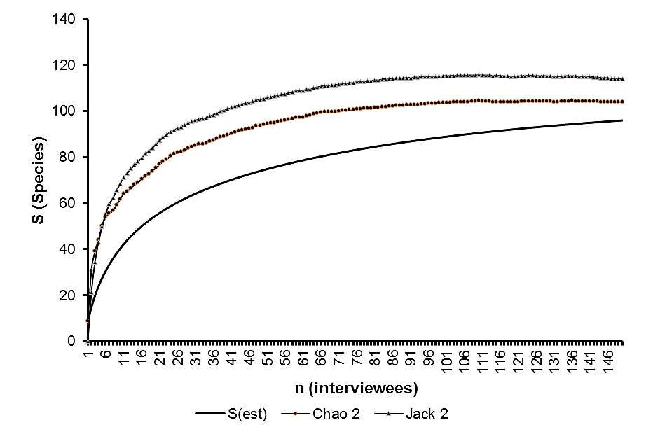 Although the richness curve of known species (S(est)) is asymptotic, it is only slightly inclined, and shows a tendency towards stabilization (Figure 2). We were apparently able to record essentially the entire inventory of birds known to the local residents, as Chao2 estimated a richness of approximately 104 species (s.e.= ±5.36 spp.) and second-order Jackknife (Jack2) estimated approximately 114 species (s.e. = 0). The curves of both estimators achieved asymptote with 86 interviewees (Jack2) and 104 interviewees (Chao2) (Figure 2). Consequently, the species inventory demonstrated a sampling effort of 92.3% (comparing S(est) with Chao2) or 84.21% (comparing S(est) with Jack2).