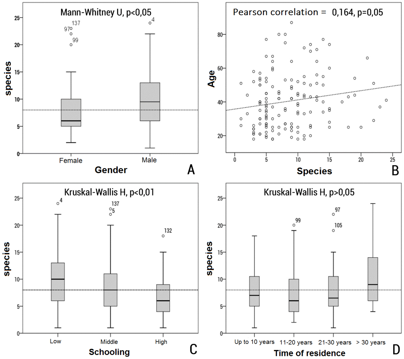The socioeconomic aspects of the residents of the Labino community, such as their gender (Mann-Whitney U, p > 0.05), age (Pearson correlation, p > 0.05), levels of schooling (Kruskal-Wallis H, p > 0.05), and time of residents in the community (Kruskal-Wallis H, p > 0.05) were not found to influence their perception of reduced species richness.