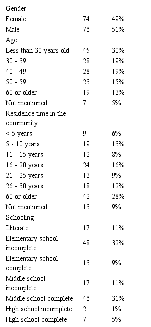 The sample population was composed of 150 interviewees (51% men [n = 76] and 49% women [n = 74]); their ages varied from 18 to 87. In general, participant schooling levels were quite low, with 11.33% (n = 17) being illiterate while 40.67% did not complete grammar school. Family incomes in the Labino community varied between 1 and 4 minimum wages (the Brazilian minimum wage in May 2016 was ~ USD $248), but most of the informants (n=92; 61%) earned approximately 1 to 2 minimum wages. The municipality of Ilha Grande had a mean human development index (MHDI) of 0.563 in 2010. The gap between the MHDI of the municipality and the maximum value of that index (1.0) was reduced by 73.45% between 2000 and 2010 (Brasil, 2013). The socioeconomic data of the interviewees are summarized in Table 1.