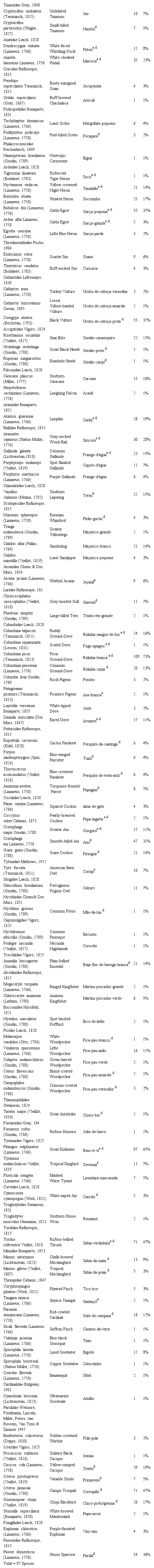 The most representative families were Columbidae and Traupidae (8 species each); followed by Ardeidae and Icteridae (6 species); Cuculidade and Picidae (5 species); Rallidae, Scolopacidae, and Psittacidae (4 species). The species with the largest numbers of citations were Columbina picui (n = 109; 73%), Pitangus sulphuratus (n = 97; 65%), Turdus rufiventris, Icterus jamacaii (ambas, n = 71; 47%), Bubulcus ibis and Coragyps atratus (n = 55; 37% each), and Passer domesticus (n = 54; 36%).