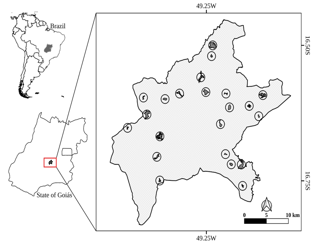 We surveyed 22 forest patches in the city of Goiânia (16°40’ S, 49°16’ W), which is located in the Cerrado biome of central Brazil. We randomly selected forest patches with an area of at least 5 ha, divided approximately equally among four size classes, i.e., 5–20, 20–40, 40–100, and 100–110 ha (Figure 1). We consider this division of classes to have the most homogeneous possible distribution of patches within the whole city. We avoided patches smaller than 5 ha because they were areas with highly degraded vegetation and the most potential risk for the field team. We confirmed the spatial independence of the study areas using the Average Nearest Neighbor test (ratio = 1.12), which measures the distance between each patch centroid and the centroid of its nearest neighbor. This ratio is calculated as the observed average distance divided by the expected average distance (based on a hypothetical random distribution of the patches within the area). If the value of the ratio is less than 1, the fragments are clustered, but if it is greater than 1, the fragments are well dispersed (Mitchell, 2005). In addition, as the buffer zones established around the focal patches did not overlap (see landscape classification section, below), they were considered to be independent sample units.