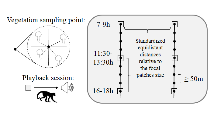 We surveyed the primate populations of the focal patches between November 2010 and July 2011 using vocal playbacks. To provide a representative sample of each patch, we adjusted sampling effort to patch size, with the smallest patches (5–20 ha) being visited twice, the next largest patches (20–40 ha) three times, and the next largest (40–100 ha), four times, while the largest patches (100–110 ha) were surveyed five times. We used the recordings of long-calls and alarm vocalizations from the Emmons project (Emmons, Whitney, & Ross Jr., 1998) and those recorded in Brazil in other study sites, kindly provided by our colleagues. We used the Audacity ® software v. 1.3.9 to clear background noise and cut the tracks. During each visit, we played recordings along transects at three different times of day (7:00–9:00h, 11:30–13:30h, and 16:00–18:00h). In order to survey the maximum possible area within each patch, we established longitudinal transects at regular intervals throughout each forest and chose three equidistant points (as far as possible) along the transect to broadcast the playbacks (Figure 2). During each playback session, we broadcast a 15-min. call twice for each species, separated by a 5-min. interval of silence.