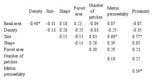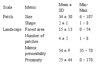 We conducted a supervised classification by visual inspection (ESRI ArcGIS 9.3) using a fine resolution orthophotograph (0.6m) to determine the land cover within a 1000-m radius of the center of each focal patch. We considered this size of radius so that the landscape established around the focal patches were represented adequately for all the species and the buffer zones did not overlap with each other. We also considered the dispersal capacity in the matrix of congener species to those monitored in the present study (Glander, 1992; Mandujano et al., 2004). The land cover of a given area was assigned to one of six categories: forest, pasture, cropland, human settlement, non-forest vegetation, and water. We calculated the size of each focal patch, and its shape and the proximity index using 800 m as the specified distance from the focal patch (McGarigal, Cushman, & Ene, 2012). The proximity index increases as the neighborhood is occupied increasingly by patches of the same type, and as these become close to each other and more contiguous (or less fragmented) in their distribution. We also calculated the area and number (fragmentation level) of all the forest patches observed within the landscape (Fragstats v. 4.2), as well as the permeability matrix index (PI), based on Arroyo-Rodríguez et al., (2013b). The PI is calculated by multiplying the percentage of each land cover category within the landscape by its relative permeability. The permeability of a given type of land cover was defined by the similarity of its vegetation structure with that of the forest, weighted as follows: 1 (water, lowest permeability), 2 (human settlement), 3 (cattle pasture), 4 (cropland), 5 (non-forest vegetation) and 6 (forest, highest permeability). The PI values recorded in the present study ranged from 16.6 (100% of the matrix composed by water) to 100 (100% of the matrix composed by forest).