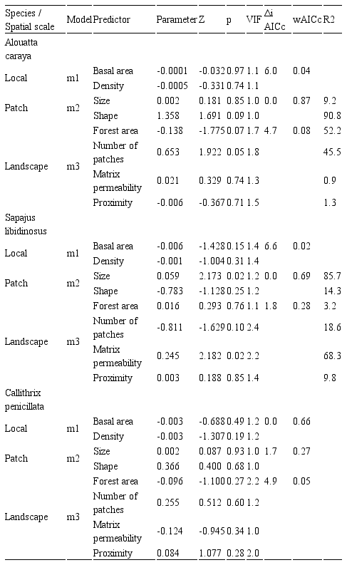 We recorded the presence of all three primate species within the study landscape. The most common species was C. penicillata, which was recorded in 91% (n = 20) of the focal patches, followed by S. libidinosus and A. caraya, which were both found in 45% of the patches (n = 10) patches (Table 2). The analyses indicated that the patch (m2) and landscape (m3) models provided the most parsimonious explanation for the occupation of patches by A. caraya and S. libidinosus (Table 3; Table 4). In the case of occupancy by S. libidinosus, patch size and the permeability of the landscape matrix were the most important metrics, both having a positive effect. The occupancy of A. caraya was positively related to the number of forest patches in the landscape and to the focal patch shape, and negatively related to the amount of forest in the landscape. The focal patch shape and the amount of forest in the landscape had a marginally relationship (p value approximately 0.05). By contrast, none of the predictors had any clear influence on patch occupation by C. penicillata, which was presumably due to the widespread distribution of this species within the landscape.