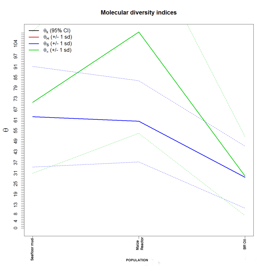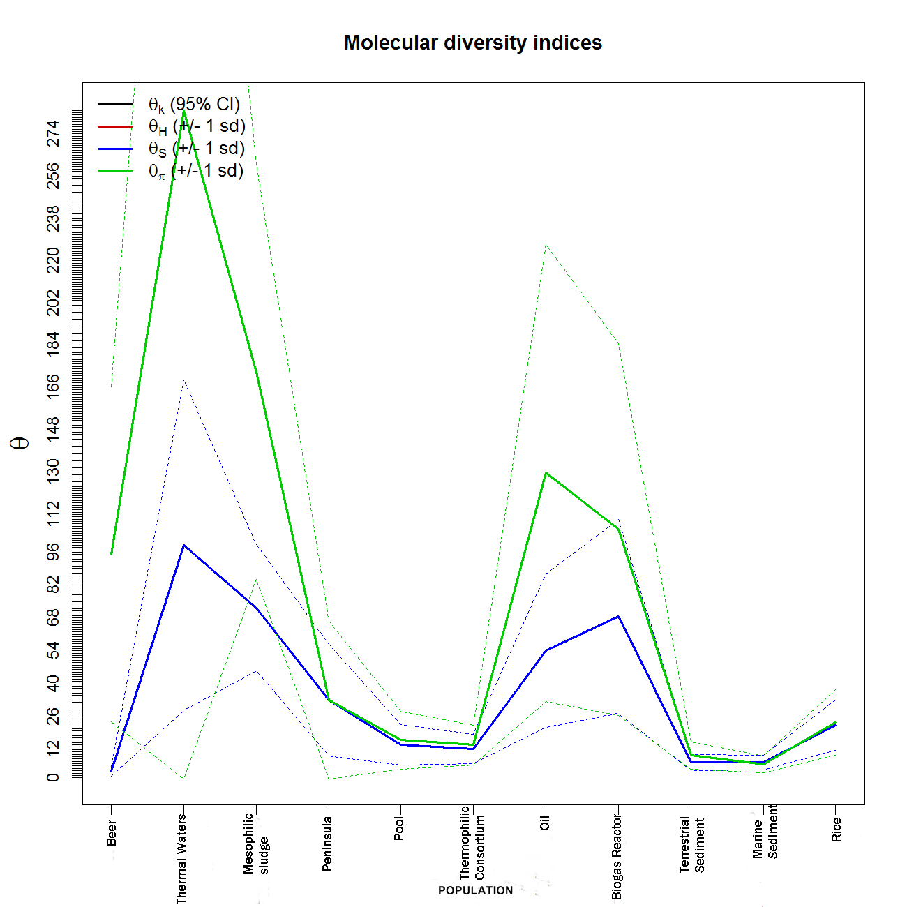 Based on the molecular diversity (Figure 3), the same pattern found in the results of (He) was observed, with Thermal waters and Mesophilic sludge showing higher diversity indexes among their sequences (θS), besides a higher average in differentiation among pairs (θπ).