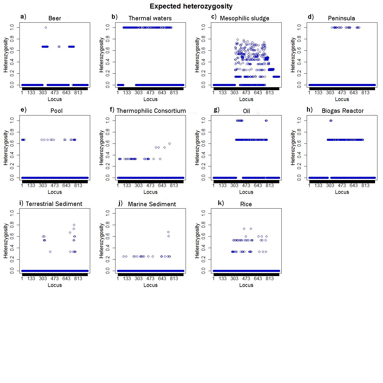 The Mesophilic sludge group (c) showed a higher number of divergent loci (positions). However, the expected average heterozygosity was low, with a value of 0.361. The values found in Thermophilic Consortium (f) (0.366), Terrestrial Sediment (i) (0.498), Marine Sediment (j) (0.289) and Rice (k) (0.461) showed low Heterozygosity averages.