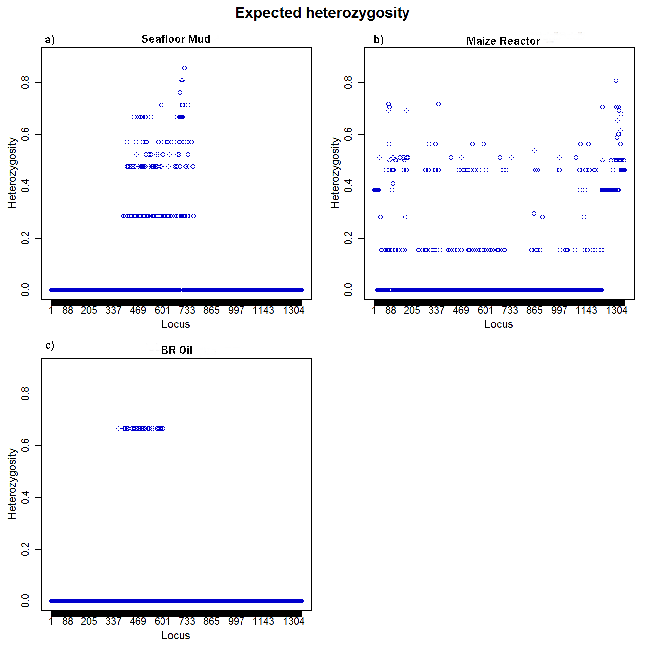 The groups of Seafloor Mud (a) (composed of seven sequences) and Maize Reactor (b) (13 sequences) showed more divergent loci; however, the expected average heterozygosity was low, with a value of 0.460 and 0.376, respectively.