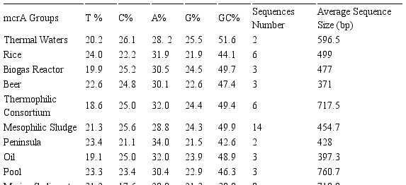 In the mcrA groups (Table 1), the largest sequence number (14) belonged to the mesophilic sludge, with an average sequence size of 454.7 base pairs (bp). However, its GC content (49.9%) was not the largest among the groups. Thermal Waters group, with only two sequences in its composition, showed larger CG content (51.6%) in mcrA groups.