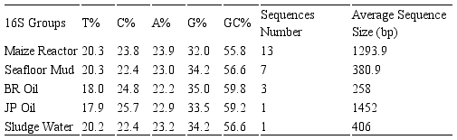 n the 16S groups (Table 2), the JP Oil group (only one sequence) had an average of 1452 bp, with 59.2% GC, representing the second largest percentage. The BR Oil group (three sequences) had an average of 258 bp and the largest amount of CG content (59.8%). The Maize Reactor group, despite having the largest number of sequences composing it (13 sequences, with an average of 1293.9 bp), showed the lowest CG content, 55.8%.