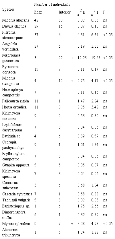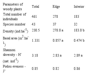 We compared the density and basal area of the species between edge and interior of the remnant applying Student