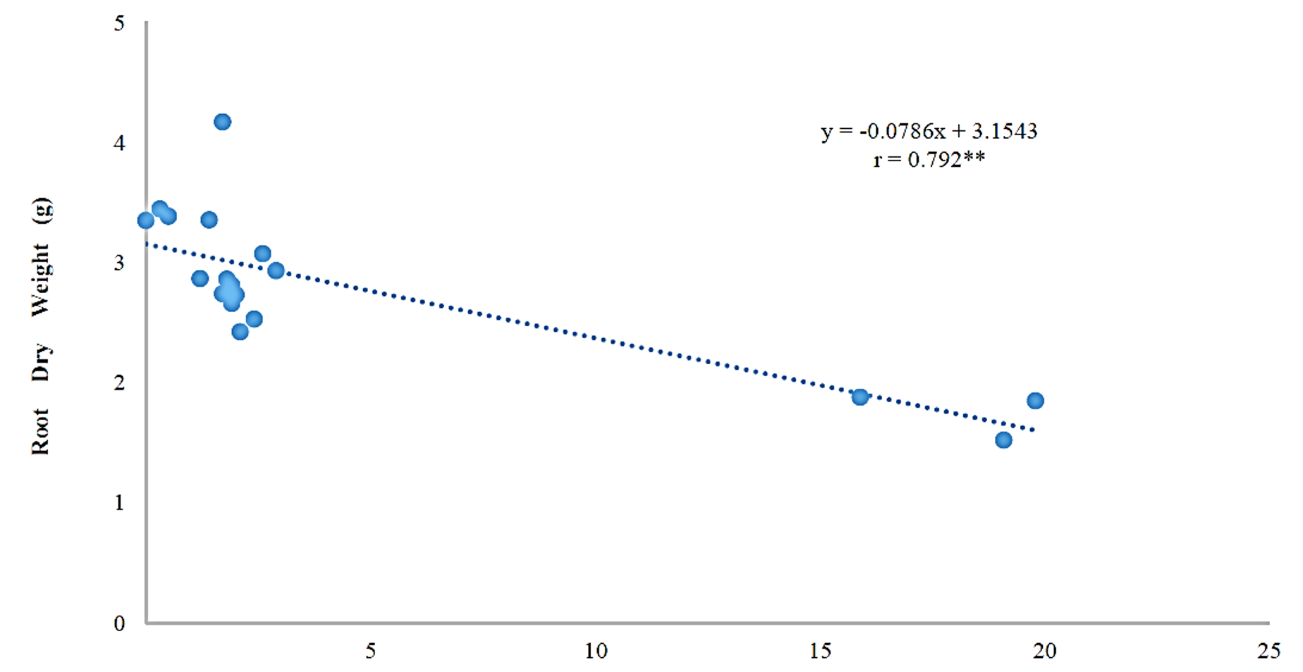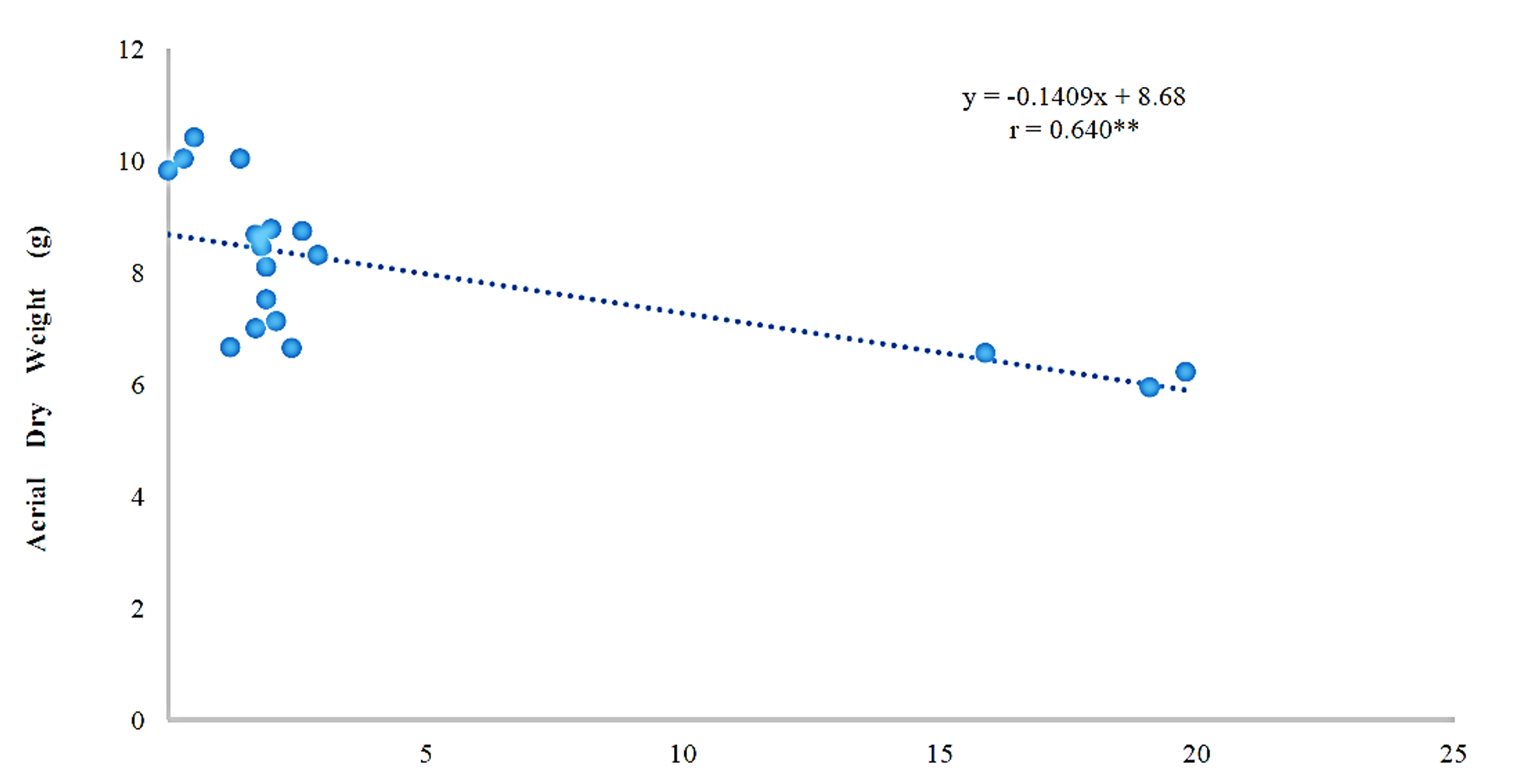 According to Figures 1 and 2, a correlation between number of galls and dry weight of the aerial and root parts of the plant was determined, reflected in the values of r with 0.640 and 0.792 respectively.