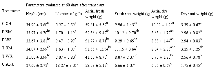 When analyzing the effect of evaluated treatments on the galling and development of tomato in greenhouse, we can observe mainly a very close tendency between the Chemical control (Fenamiphos) with the selected bionematicides, reflected in a summary of all results obtained ± SD (Standard deviation) and the level of significance of each one (Table 1).