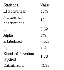According to the results obtained, the value -1.65 indicates that the alternating hypothesis is accepted, that is to say that the bionematicides formulated with strains of local nematophagous fungi, controls the galling of the roots of tomato plants grown in greenhouses in at least 60% of a synthetic nematicide (Table 2) (Figure 3).