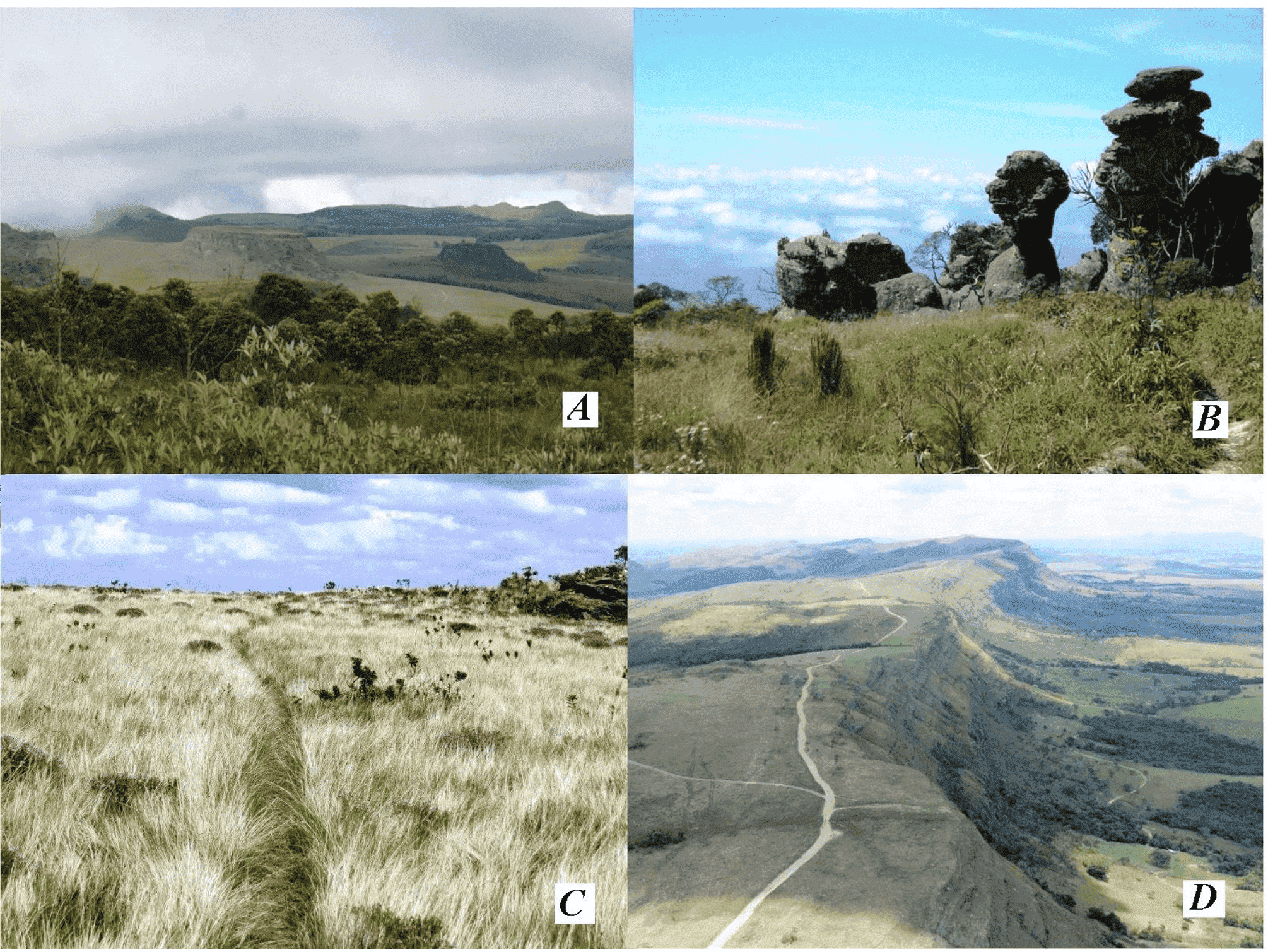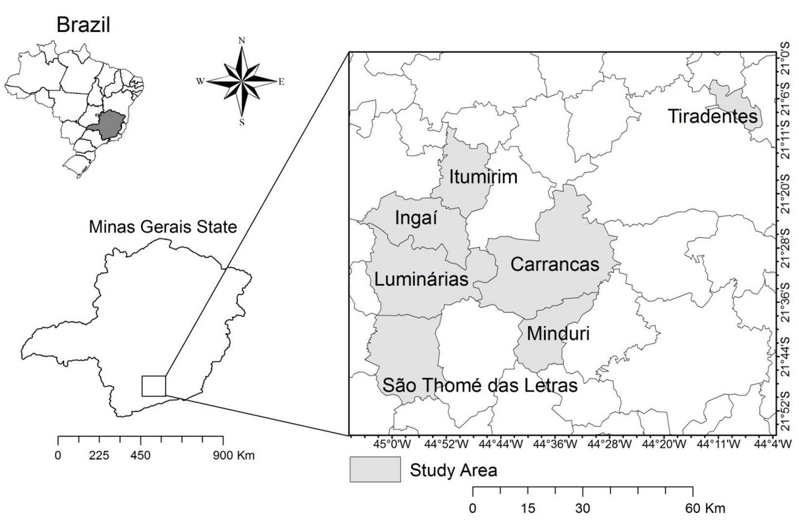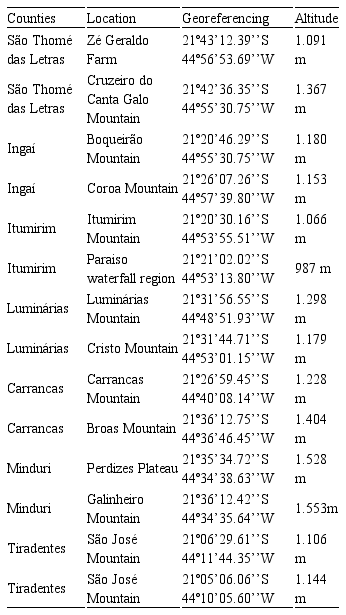 This vegetation type is distributed along the Espinhaço Range, but isolated areas of this kind of landscape are located in Central Brazil, for example: Chapada dos Veadeiros and Serra dos Pirineus in Goiás State. We also found this vegetation in the west of Minas Gerais State in Serra da Canastra and in the South in the cities of São João Del Rei (Serra do Lenheiro), Tiradentes (Serra de São José), Carrancas (Serra de Carrancas), Minduri (Chapada das Perdizes), Luminárias (Serra Grande), São Tomé das Letras (Serra do Cruzeiro do Canta Galo), Itumirim (Serra de Itumirim), Ingaí (Serra do Boqueirão) and Itutinga. The last nine cities are in Serra da Mantiqueira, with similar geology and floristic compositions to the Espinhaço Range (Eiten, 1992; Alves & Kolbek, 1994; 2009; 2010; Gavilanes, Brandão, Laca-Buendia, & Araujo, 1995; Harley, 1995; Giulietti et al., 1997; Alves et al., 2007; Rapini, Ribeiro, Lambert, & Pirani, 2008; Vasconcellos, 2011).