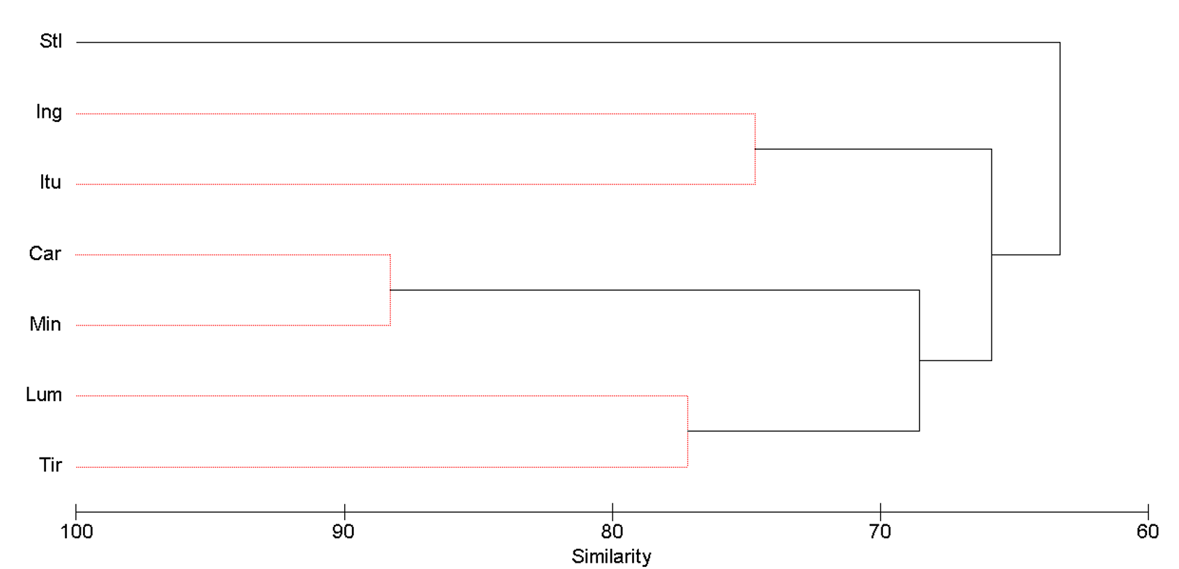 The cluster demonstrated a similarity between the bird community of rupestrian fields from the counties of Tiradentes and Luminárias; Minduri and Carrancas, Itumirim and Ingaí. The community from São Thomé das Letras city is the most different when compared among the other communities (Figure 3). The similarity is related to geographical proximity, considering that the sampling areas are continuous from a mountain range, and also the similarities are explained to their disturbance degree. In contrast, although the sampled vegetation type from São Thomé das Letras city is in good condition (Figure 1C), the landscape contains the presence of mining companies and has a great number of mining tailings (see Chiodi Filho, Artur, & Rodrigues, 2005), and therefore natural vegetation is absent in several areas, in turn presenting a human effect on the bird fauna (Figure 5).