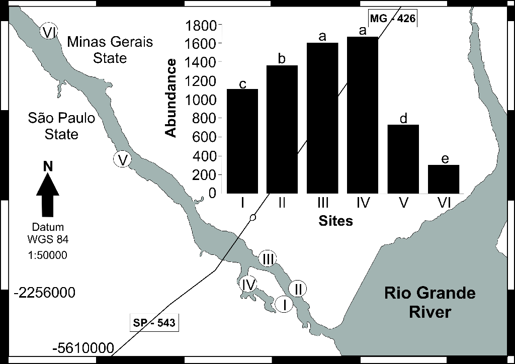 Site V: Unconsolidated substrates, and relatively well-preserved margins, with the presence of many trees and grasses. The presence of floating and submerged macrophytes was noticed throughout the entire sampling. Situated 3490 m from the dam in the São Paulo’s side margin.