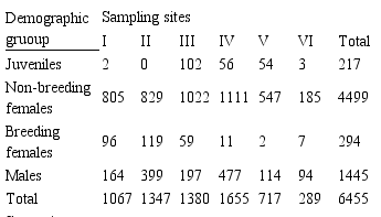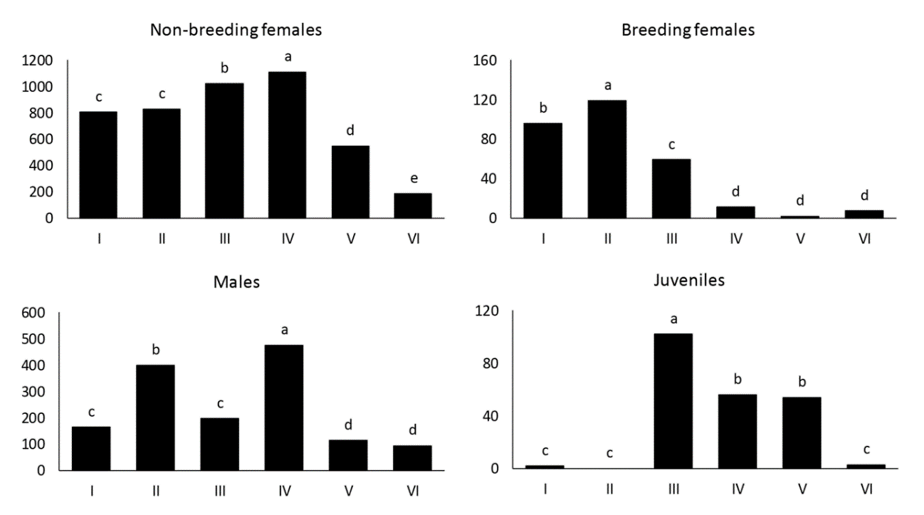 When evaluating the spatial distribution of each demographic group we noted that females were more abundant in site IV (331 ± 8.6) and less abundant in site VI (58 ± 1.4). Breeding females were more abundant in site II (23.8 ± 3.7) and less in sites IV to VI. Juveniles were more abundant in site III (20.4 ± 2.8) and less in sites I, II, and VI. Males were more abundant in site IV (95.4 ± 6.8) and less in sites V and VI (Figure 2).