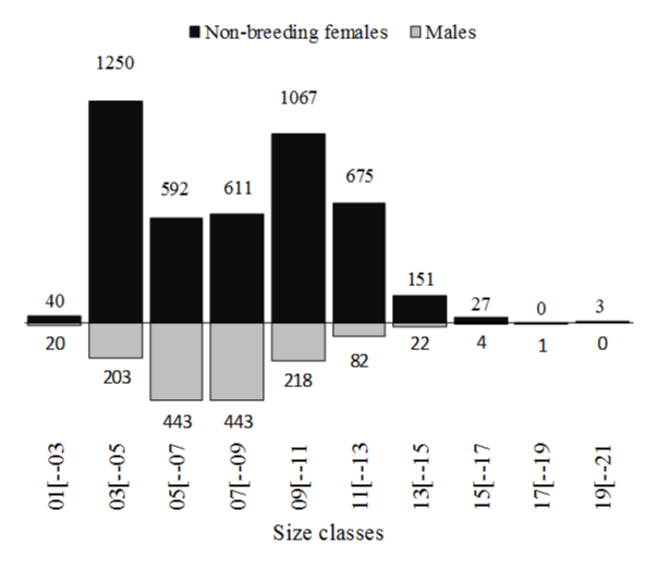 The individuals were groups in 10 size classes of 2 mm amplitude. The frequency distribution indicated a bimodal pattern for males and females (Figure 3).