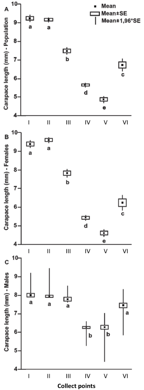 Mean female size was 7.50 ± 3.47 mm CL, mean male size was 7.44 ± 3.40 mm, and mean juvenile size was 3.24 ± 1.10 mm. The smallest individual was a juvenile of 1.08 mm de CC found in site III, and the largest was a breeding female with 20 mm found in site II. There were no significant differences between the size of males and females (T-Test = 0.62, p = 0.53), however, a differential distribution according to size was observed: the largest individuals were found in the sites near the dam (I and II), whereas the smallest were found in site V (Figure 4A). Regarding the demographic groups, females were more abundant in sites I and II (Figure 4B), and males were evenly distributed in sites I to III and VI (Figure 4C).