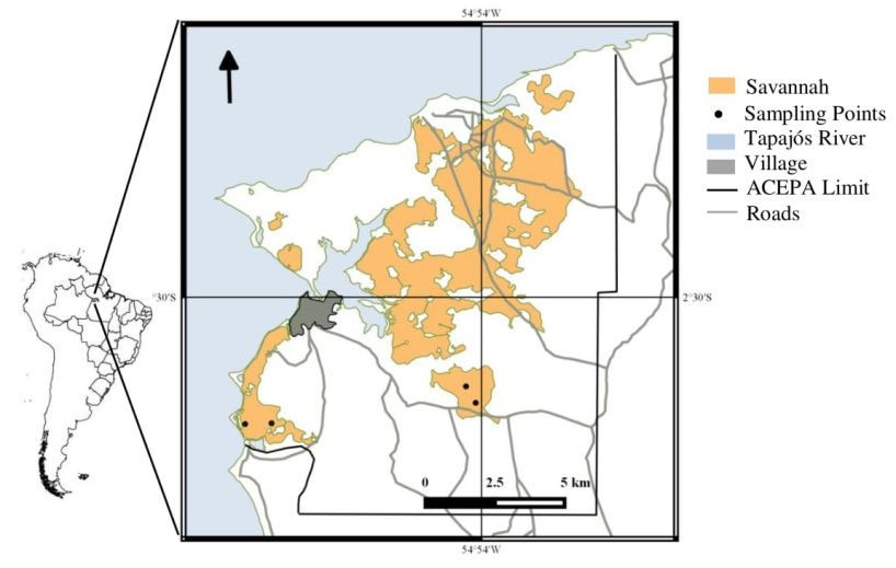 The Brazilian Amazon contains approximately ¾ of the Amazon biome, considered to be the world´s largest phytogeographic domain of tropical forests, 90% of which is composed of tropical forest with the remainder made up of other vegetation types such as savannah, floodplain forests, and areas subjected to annual flooding (Ab’Saber, 2002). Enclaves of savannah are characterized as Amazonian savannahs (Ab’Saber, 2002), which are little known, highly threatened and under-protected (Carvalho & Mustin, 2017) and occupy approximately 150.000 km² of the Amazon basin (Pires & Prance, 1985). In the State of Pará savannah is present on the island of Marajó, Alto Paru, Monte Alegre, the region of the Trombetas River, Santarém, Serra dos Carajás and Serra do Cachimbo (Pires & Prance, 1985). In the Santarém region a large part of the savannah resides in the Alter do Chão Environmental Protection Area (ACEPA) (Magnusson, Lima, Albernaz, Sanaiotti, & Guillaumet, 2008).