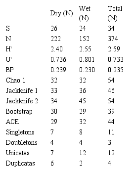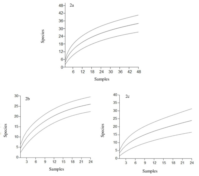 The richness estimate for this season showed that this sampling collected between 76% and 90% of expected species. The ACE estimator yielded 39 species and Jackknife 2 estimated 34 (Table 2), and this result supports those from the species accumulation curve which continued rising (Figure 2b).