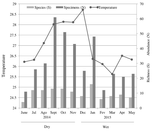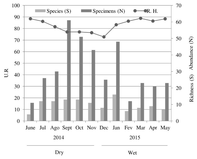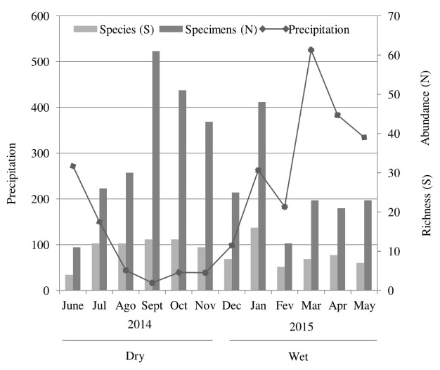 In the wet season 152 specimens (N) distributed across 24 species (S), with 8 being exclusive to this period, with 124 males and 28 females. The month of January had the greatest richness and abundance (S= 16, N= 48), and the month of February was the month with the lowest N (12) and S (6) (Table 1 and Figure 3).