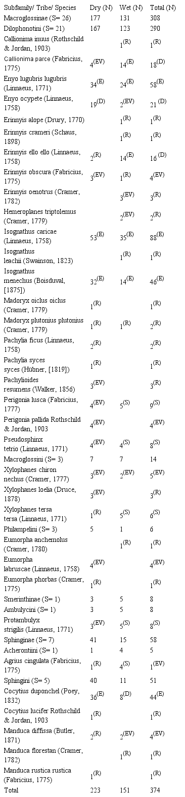 With respect to dominance, four were eudominant (12%), three dominant (8%), four subdominant (12%), five occassional (14%), and 19 rare (54%). The eudominant species were: Isognathus caricae (Linnaeus, 1758) (N= 88), Enyo lugubris lugubris (Linnaeus, 1771) (N= 58), Isognathus menechus (Boisduval, [1875]) (N= 46) and Cocytius duponchel (Poey, 1832) (N= 44).