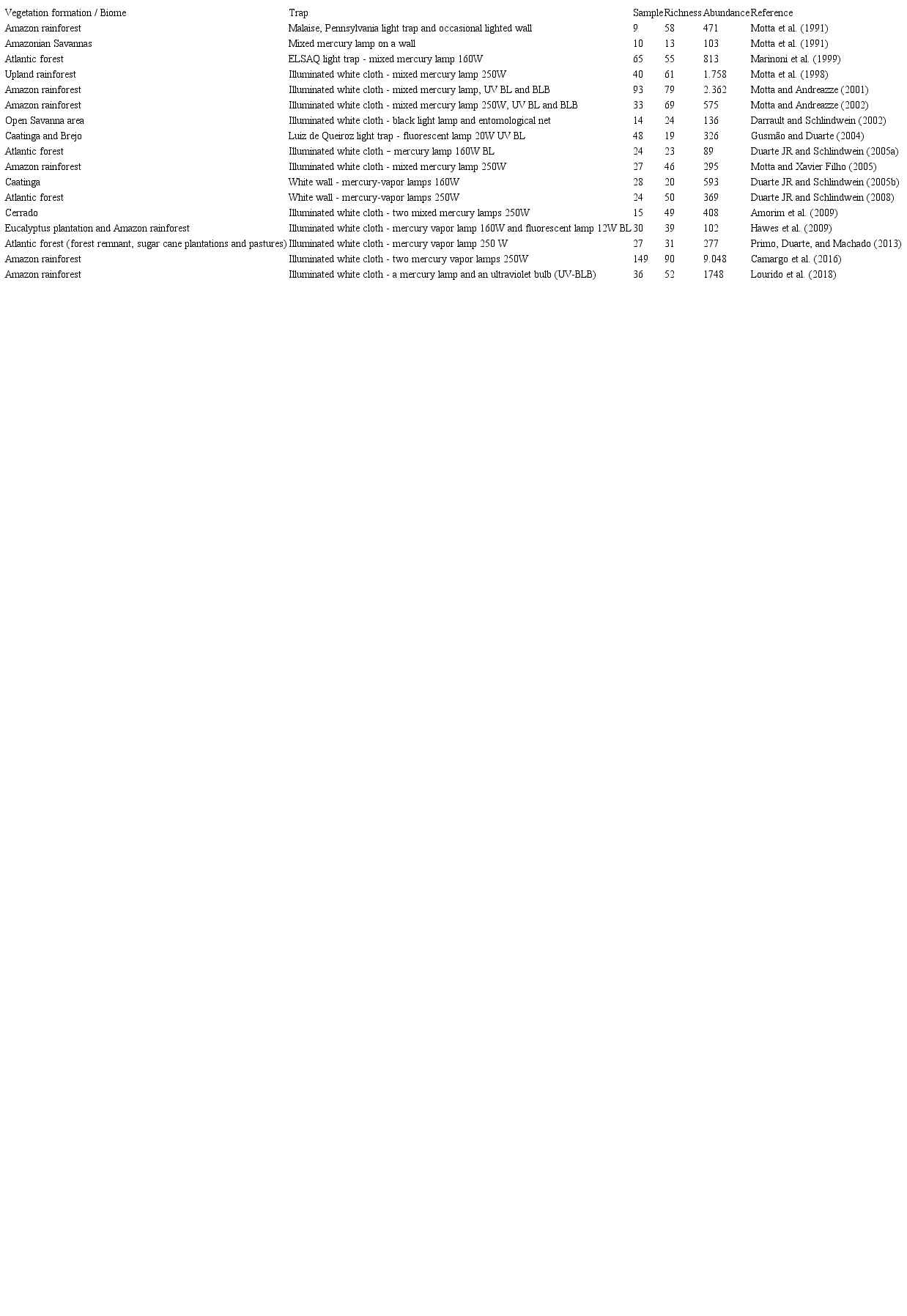 The striking differences between the values for diversity and richness between the study sites mentioned above could be related to the collection technique as influenced by the geographical characteristics of the region studied. For example, the savannah studied in the current study is made up of patches of savannah inserted in the tropical forest, and due to this fact low-power light traps were used in order to reduce the radius of the sampled area, but in the studies mentioned above light traps with a larger radius of luminosity, and therefore of capture potential, were used (Table 3). It was also observed in this study that sample size is a key factor for the determination of greater richness and abundance.