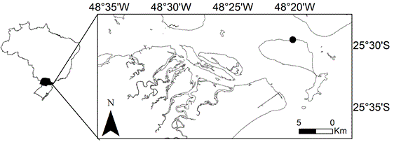 Fish were caught on an estuarine beach located near the mouth of the Paranaguá Estuarine Complex, State of Paraná, Brazil (25º28’ – 25º36’S; 48º20’ – 48º28’W, Figure 1). Paranaguá Estuarine Complex, due to its continuous cover of the Atlantic Forest, is considered a Natural Heritage of Humanity (United Nations Educational, Scientific and Cultural Organization [UNESCO], 2019). However, it is an environment greatly impacted by the domestic sewage and the port terminals of the region (Barletta & Lima, 2019). It is located on the coast of the State of Paraná, occupying an area of 612 km2, divided into two main axes, north-south (Laranjeira and Pinheiro Bay) and east-west (Paranaguá Bay) (Lana, Marone, Lopes, & Machado, 2001). This estuary is dominated by tidal, characterized as semi-diurnal tides with a salinity range between 0 and 33.2°C and a temperature range between 17 and 31°C (Dias et al., 2016).