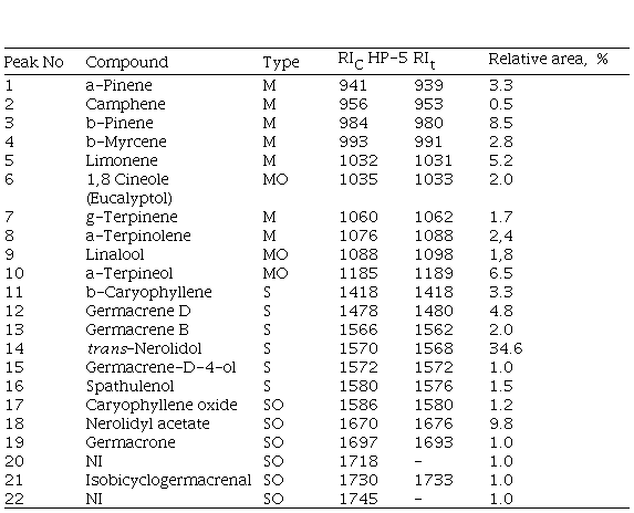 The yield of EO from S. glutinosa was 0.53% (w w-1). In the GC-MS analysis, 89.5% of the volatile composition could be identified (Table 1). Figure 2 shows a typical chromatogram from S. glutinosa essential oil. Peak identification can be seen in Table 1.