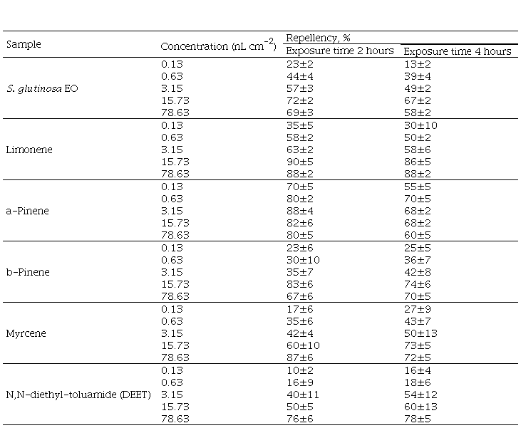 EO from S. glutinosa displayed the best repellent activity in higher concentration (15.73 nL cm-2) after both exposure times, with a repellency percentage of 72±2 % at two hours and 67±2 % at four hours. This was compared to a commercial repellent DEET (N, N-diethyl-toluamide) at the same concentration with an activity of 50±5% for the first two hours and 60±13 % after four hours (Table 2). However, the repellent activity of DEET was highest at 78.63 nL cm-2 (76% at 2 hours). These results show that the EO of S. glutinosa exhibited a repellent activity close to that of the commercial repellent.