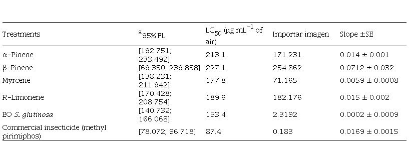The toxic effect from S. glutinosa EO and terpenes were tested on T. castaneum. Filter paper discs (Whatman No. 1, 2-cm in diameter), deposited at the bottom of Petri dish covers (90 x 15 mm), were used. These were impregnated with oil at doses calculated to provide equivalent fumigant concentrations of 500, 350, 250, 150, 50 µg of oil mL-1 air, respectively. Twenty adult insects (1 to 10 days old) were introduced and tightly capped (replicated four times for each concentration). Pirilan, a commercial pesticide containing methyl pirimiphos (organophosphorus pesticide, 300 μg. mL-1 air) as an active ingredient, was used as positive control. The mortality percentage was determined after 24 hours from the start of exposure (Prieto, Patiño, Delgado, Moreno, & Cuca, 2011).