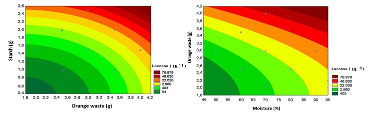 As a feature of the RSM, the interaction between the variables in the laccase production was easily noticed, because even in experiments where there were large pools of carbon, the enzyme activities were low when the initial moisture of the culture was at or below 70%, for example, in treatments numbers 11, 18 and 22 in Table 2.