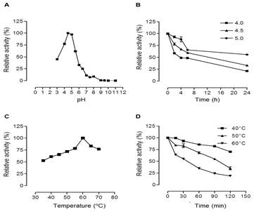 For determination of the pH optimum, the enzyme was assayed with malonate (pH 3.0, 50 mmol L-1), citrate (pH 4.0–6.0, 50 mmol L-1), phosphate (pH 6.0–7.5, 50 mmol L-1), Tris-HCl (pH 8.0–9.5, 50 mmol L-1) and glycine buffer (pH 10.0-11.0, 50 mmo L-1) at 40. The effect of pH on stability of the crude laccase was determined after 24 hours incubation of laccase in 50 mmol L-1 sodium acetate buffer (pH 4; 4.5 and 5.0) without substrate at room temperature (25°C). The remaining activities were measured under standard conditions.