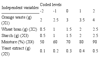 A central composite design (CCD), 2 ** (5-1), was employed to evaluate the influence of different variables in the production of laccase and to obtain the best conditions in citrus residue (Table 1). Five independent variables were evaluated: orange waste (X1), wheat bran (X2), starch (X3), moisture (X4) and yeast extract (X5). The experiment was carried out with a total of 30 combinations (Table 2), including 16 cubic points, 10 axial points and four central points. The results were adjusted by a second order polynomial equation. The substrates were added in Erlenmeyers flasks of 125 mL and moistened with mineral medium Vogel (Vogel, 1956) to obtain the necessary moistures. The Erlenmeyers flasks were autoclaved at 120°C for 15 min. Two disks with mycelium (7 days and 15 mm of diameter) of P. pulmonarius were inoculated in each Erlenmeyer flask, which were incubated at 28°C in the dark, for 12 days. Cultivation was interrupted with the addition of 20 mL of distilled water, followed by agitation for 20 min. at 8 ºC, filtration and centrifugation (10 min.; 10,000g; 4 ºC). The supernatant was used as crude enzymatic solution.