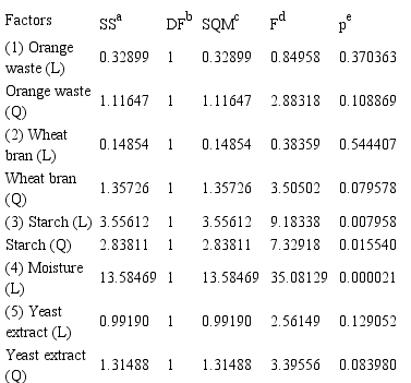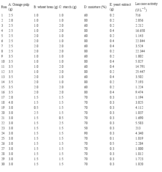 A factorial design was developed in the pursuit of studying the influence of five variables and also to verify the interactions between them on the production of laccase by P. pulmonarius. The selected variables were a certain amount of orange waste (g), wheat bran (g), starch (g), yeast extract (g) and moisture (%). The experimental results are shown in Table 2.
