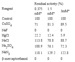 The enzyme was activated by NaCl and Na2SO4at 0.375 mmol L-1, but at higher concentrations there was inhibition.